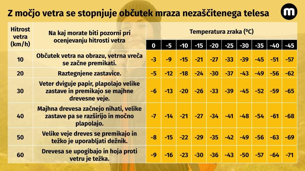 Ste vedeli, da se z močjo vetra stopnjuje občutek mraza nezaščitenega telesa? Kakšen je občutek mraza pri -15 ⁰C in močjo vetra 60 km/h?